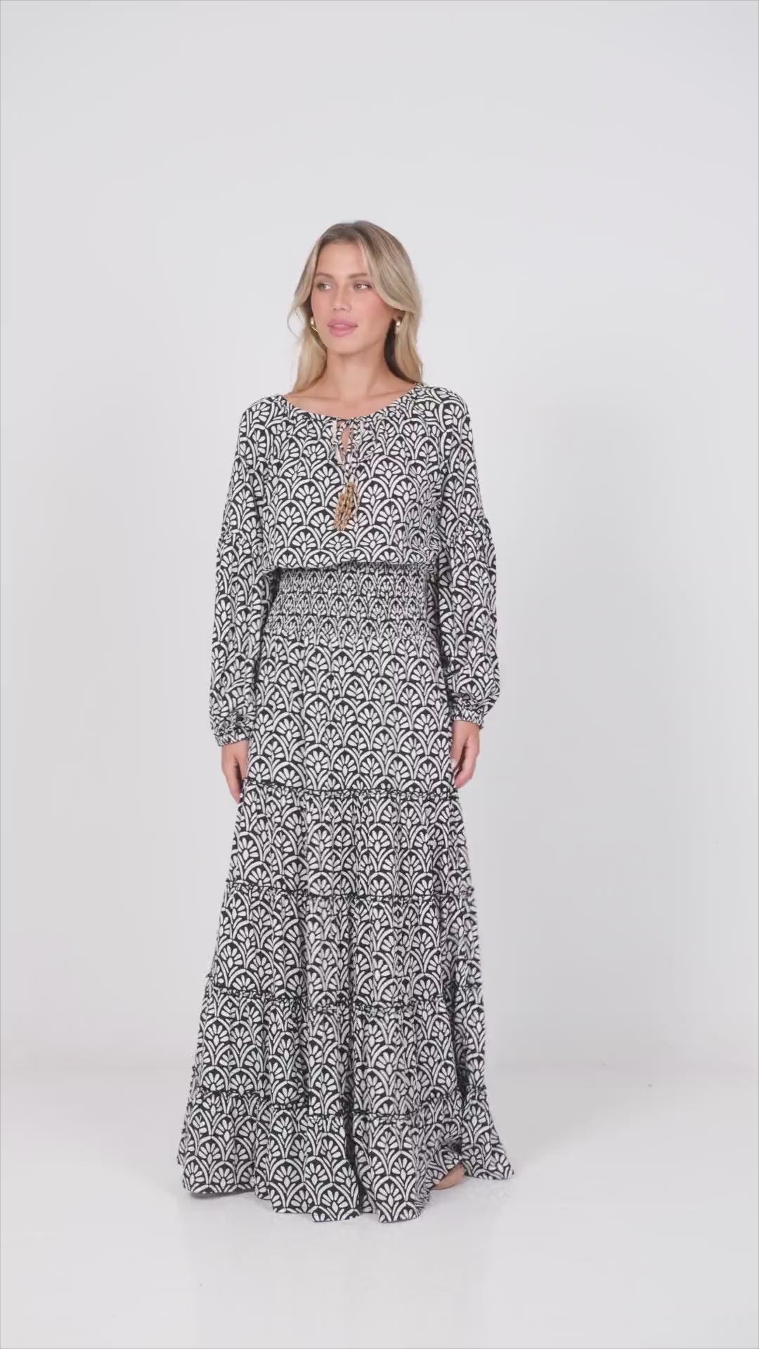 Breezy and romantic, this maxi dress features a flowing silhouette with soft long sleeves and a flattering elastic waist. Feminine, effortless, and endlessly wearable made for barefoot beach walks, market mornings, or sunset dinners.