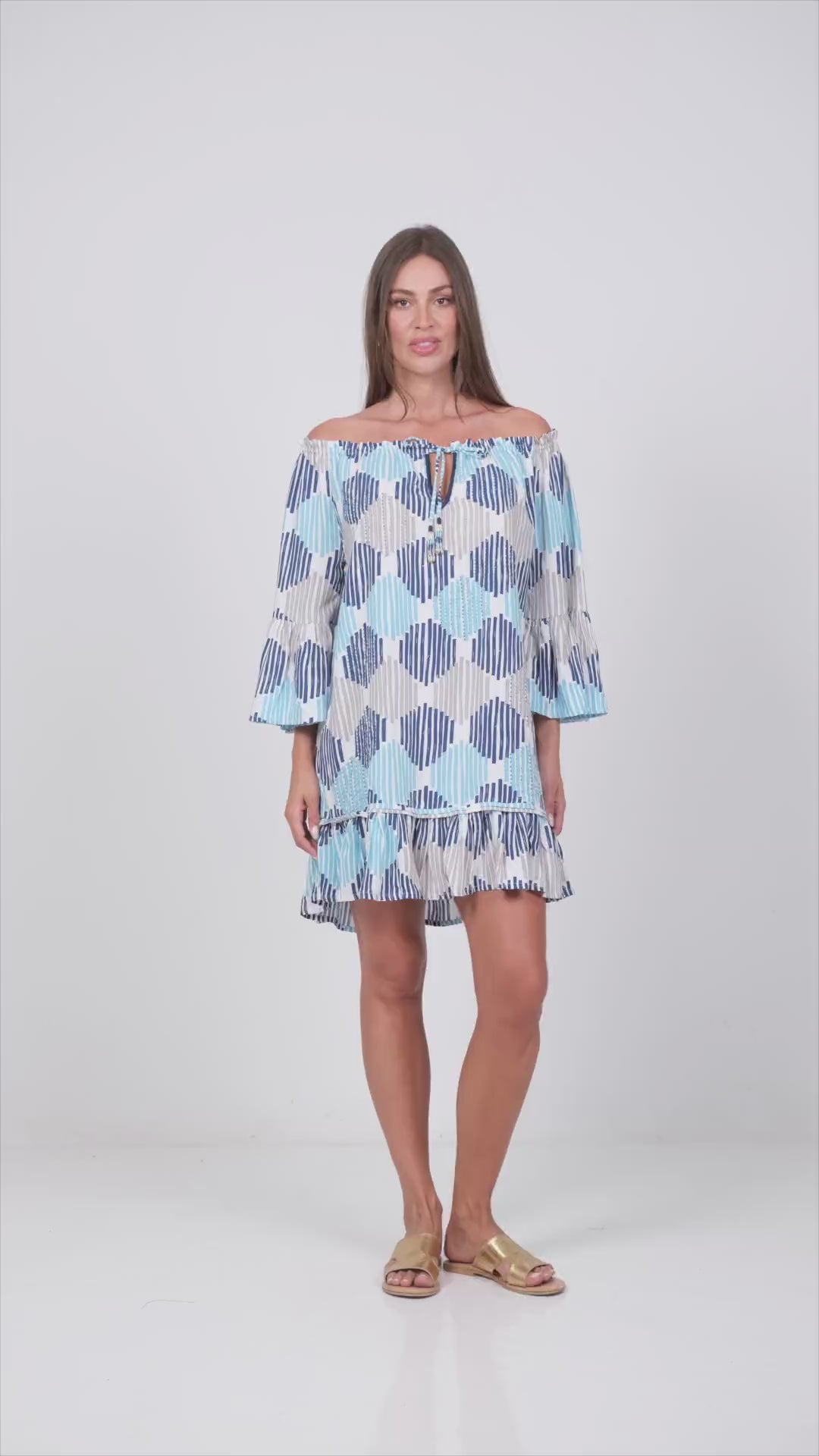 Flirty and lightweight, this off-shoulder mini features soft ruffle details at the sleeves and hem for playful movement. An easy, breezy piece made for sun-filled escapes.