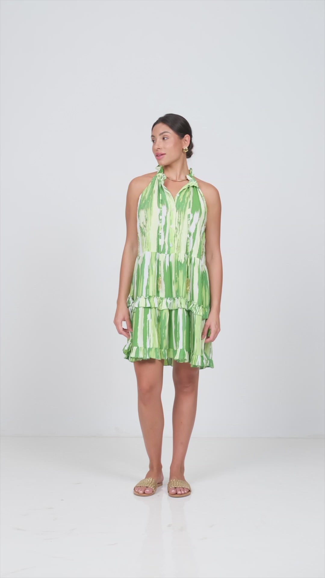 Playful and light, this halter mini features a tiered ruffle skirt and an easy, swingy silhouette. A go-to for warm days, golden hours, and everything in between.