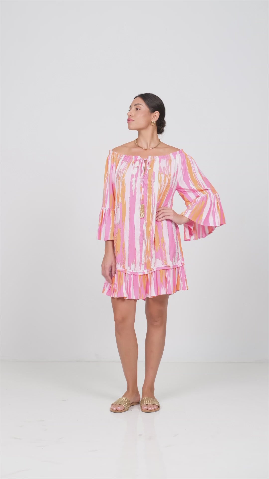 Flirty and lightweight, this off-shoulder mini features soft ruffle details at the sleeves and hem for playful movement. An easy, breezy piece made for sun-filled escapes.
