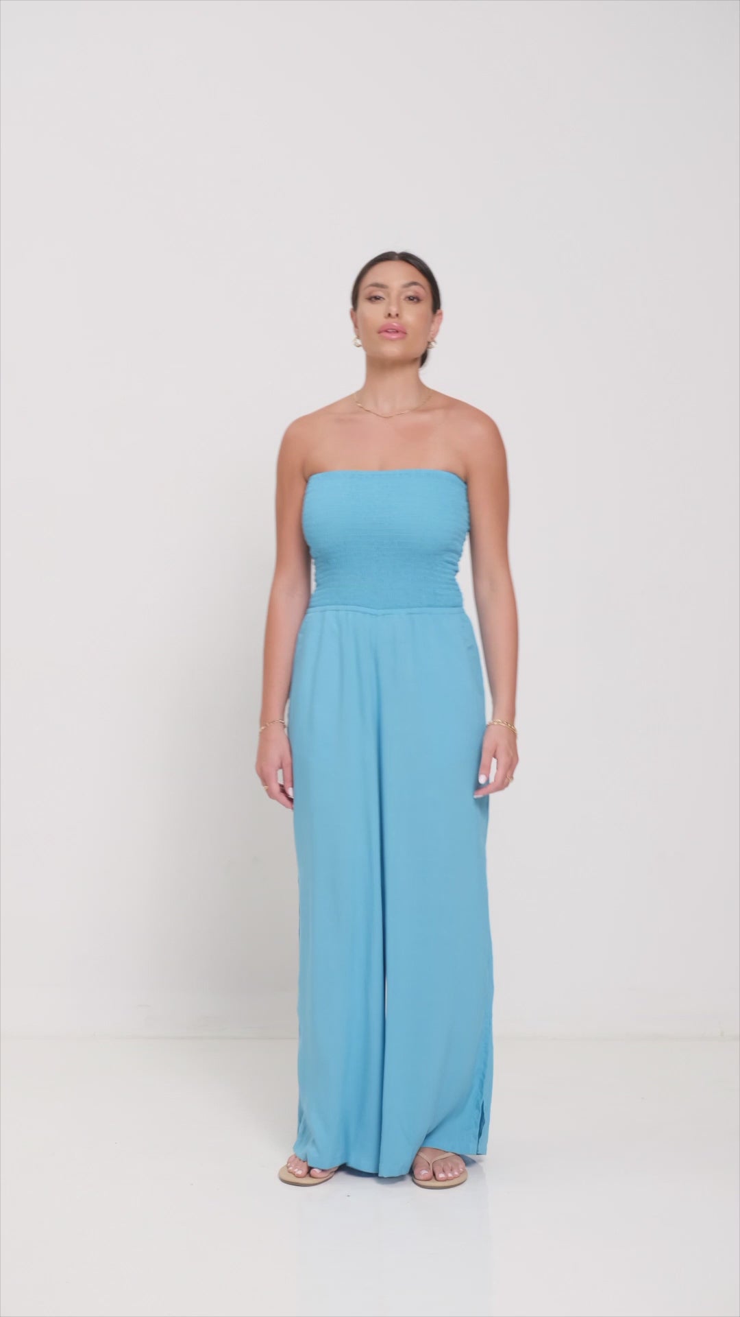 Carefree spirit in one easy silhouette. This strapless jumpsuit features a smocked bodice and wide-leg design for all-day comfort and effortless style. Bold, breezy, and made for sun-drenched getaways.